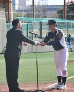 「大阪産業大学Bチームキャプテンの荒木です。しっかり良い成績を残せてよかったです。次は春のリーグ戦に向けて頑張っていきたいと思います!」